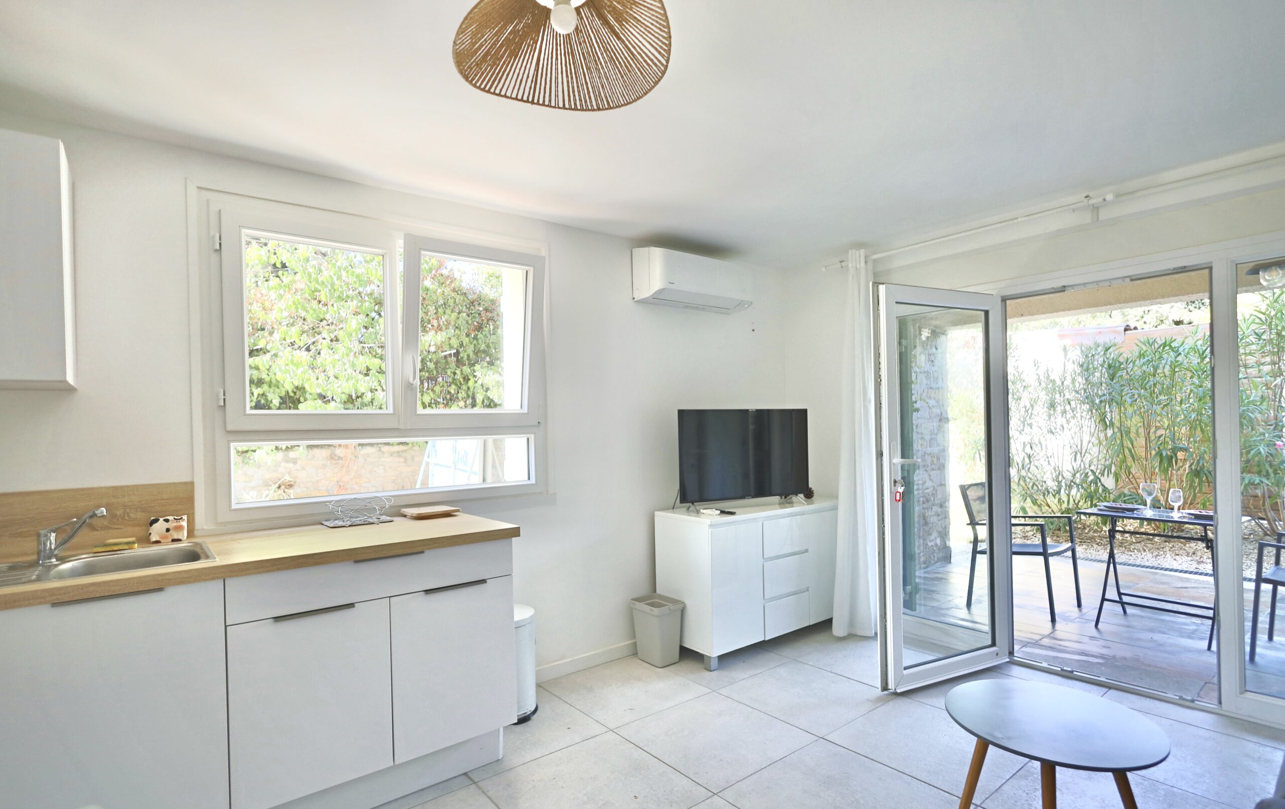 Découvrez notre appartement meublé de type 1 pièce, climatisé et entièrement indépendant, idéalement situé au rez-de-chaussée de la maison des propriétaires. Vous profiterez d’un espace de vie lumineux et convivial, avec un canapé-lit confortable en 140x190, une télévision LED, un meuble de rangement, une table basse et un coin repas avec table et chaises. La cuisine ouverte et entièrement équipée vous permettra de préparer vos repas en toute simplicité, tout en restant connecté à votre espace de vie. Un placard de rangement complète cet appartement, pour que votre séjour soit à la fois pratique, confortable et agréable.