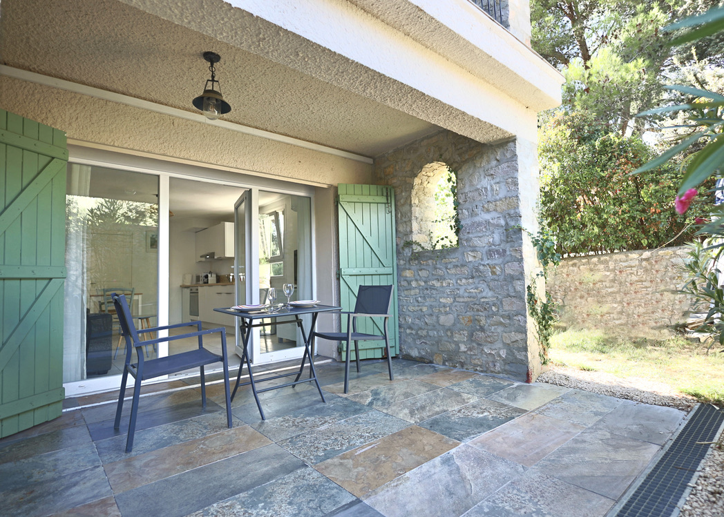 • Terrasse privative aménagée avec table et 2 chaises. Tables et chaises complémentaires à disposition • Accès partagé à la piscine (8x4m) • Jardin arboré d’oliviers et de chênes • Table de ping-pong • Barbecue commun dans le jardin